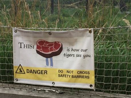 Emma told me that James, or Jim, as I call him, was specially keen to see the tigers and lions. We managed to arrive at the tiger enclosure just at feeding time, and we saw Mum and Dad tiger, Jae Jae and Melati by name, with their two rather large cubs, Achilles and Karis, enjoying some large steaks. On the way out of Tiger Territory we saw a sign with a picture indeed showing a nice steak, with a caption which said, ‘This is what you look like to a tiger’: that is, lunch.